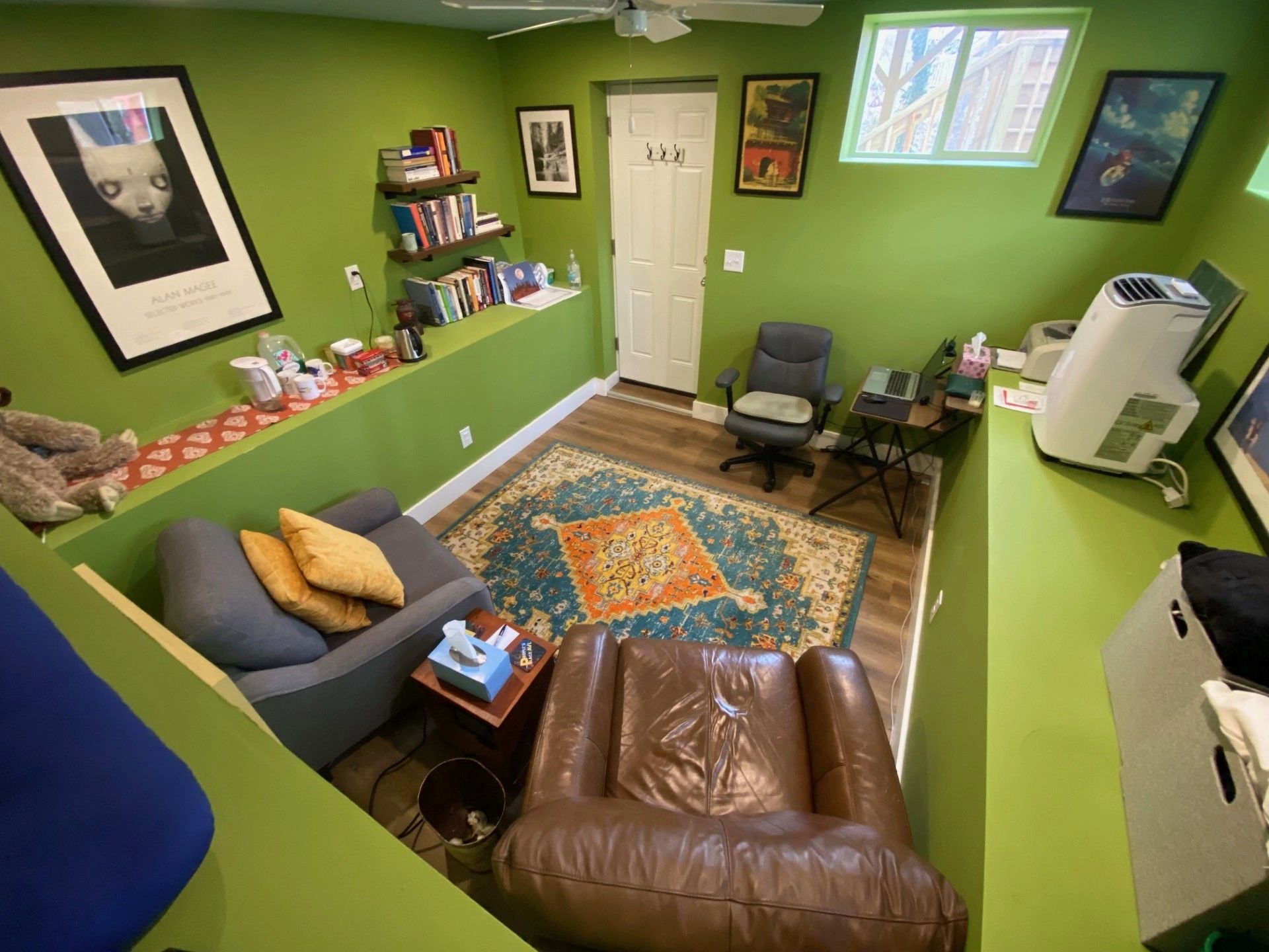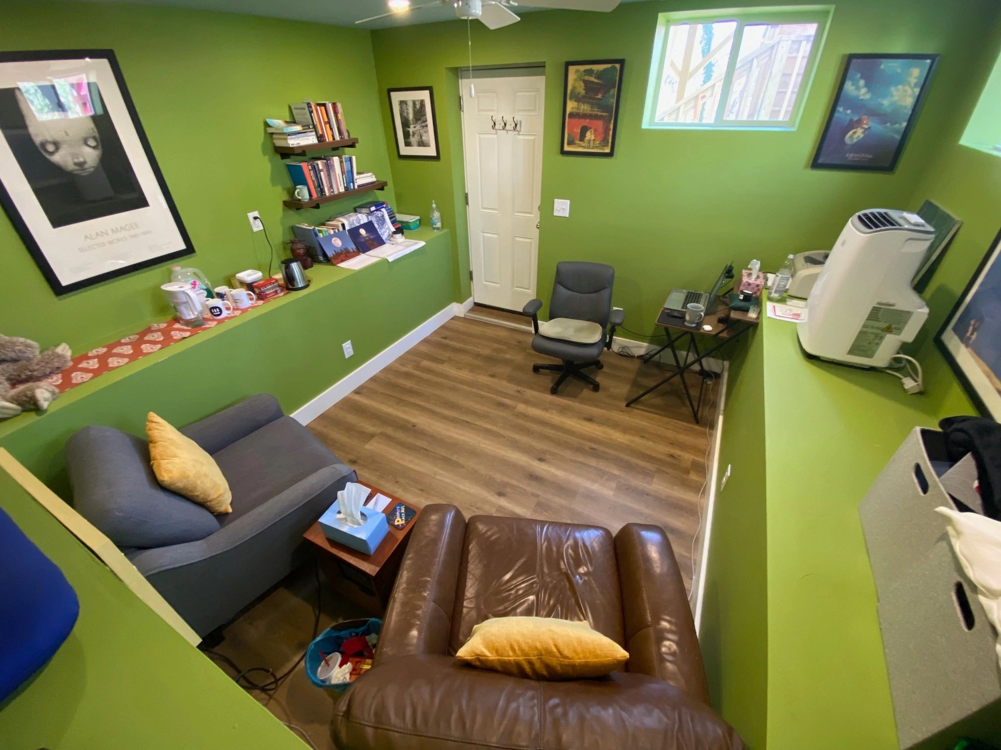 My office is in the above-ground lower floor of my family’s home in West Asheville. The office (pictured) has a separate entrance and is not accessed through the main house. It does not have an attached bathroom, and if you require one, you are welcome to use the one in the main house. Regrettably, my office is not wheelchair-accessible. To protect my family's privacy, I complete a phone screening with prospective clients before sharing my address.